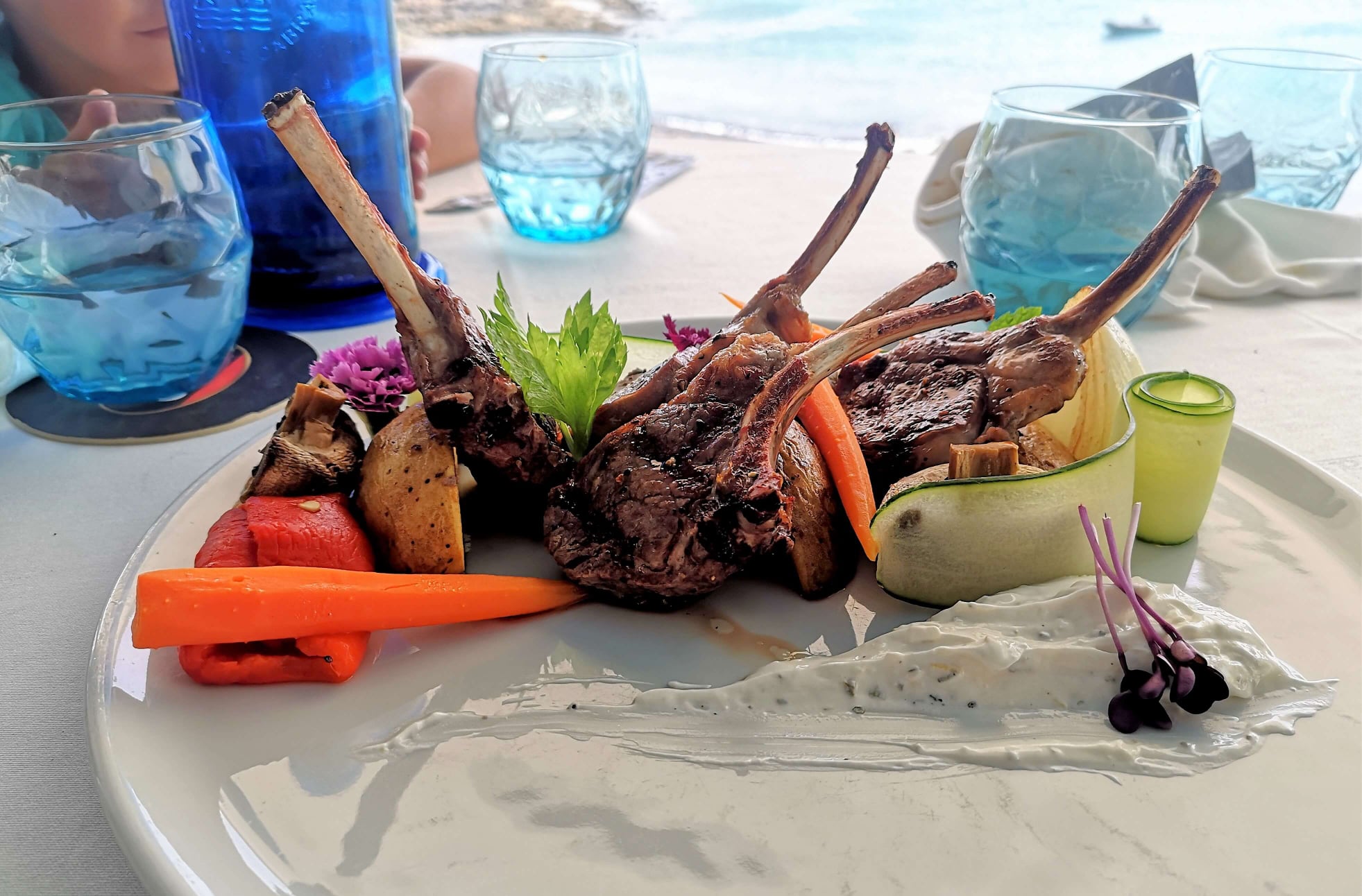 Hemos disfrutado de una deliciosa comida en una mesa junto a la ventana, con vistas al mar. Compartimos unos patés hi 5 (berenjena, hummus, yogur, huevas rojas y aceitunas) con pan pita. De segundo tomamos mousaka y dolmades.